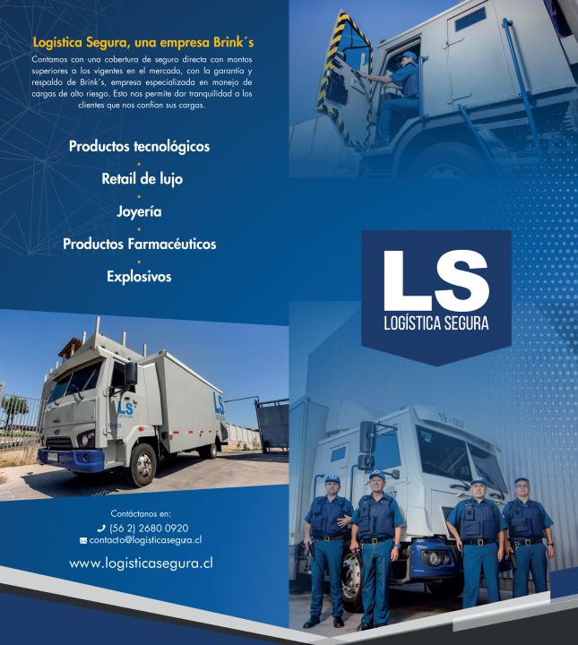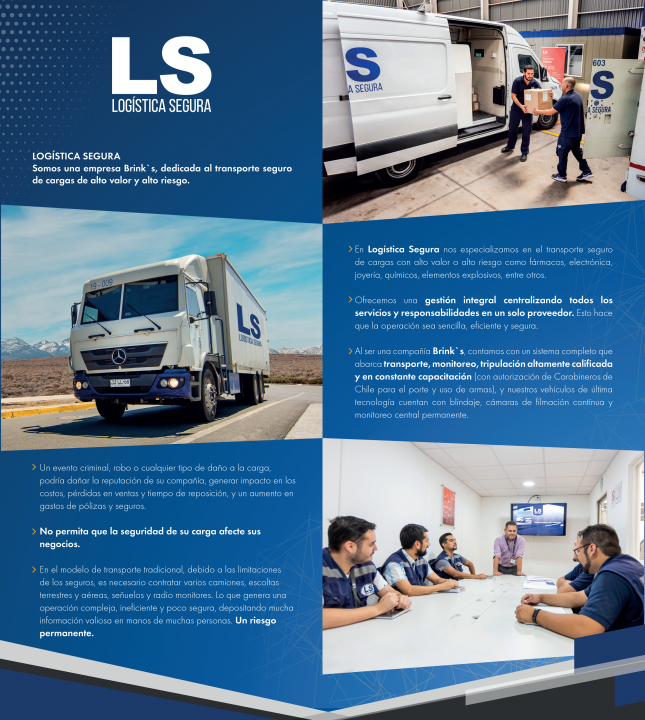 Además, ofrecemos una cobertura de seguro directa con montos superiores a los vigentes en el mercado, con la garantía y respaldo de Brink´s, empresa especializada en manejo de cargas de alto riesgo. Esto nos permite dar tranquilidad a los clientes que nos confían sus cargas.