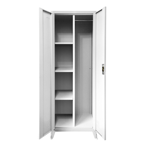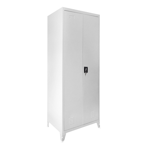 Roperos metálicos de dos cuerpos, con refuerzos tipo omega a lo largo de las puertas y cerraduras tipo españoleta de dos puntos. Cada mueble posee pies de altura con regatones ajustables.