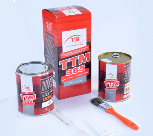 TTM 385 es un sistema elastomérico bi-componente de alto desempeño, libre de Tolueno y otros compuestos tóxicos nocivos a personas y medioambiente. Se utiliza para reparación de cubiertas de correas transportadoras y elementos de caucho natural o sintético de uso industrial.