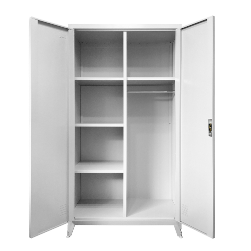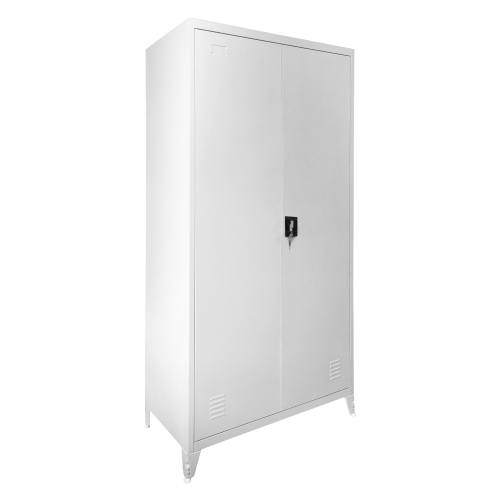 Roperos metálicos de dos cuerpos, con refuerzos tipo omega a lo largo de las puertas y cerraduras tipo españoleta de dos puntos. Cada mueble posee pies de altura con regatones ajustables.