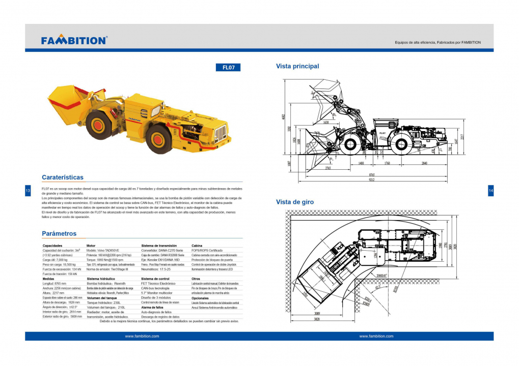 Las partes principales de FL07 usan una marca de fama internacional, el sistema de control de todo el vehículo adopta tecnología de comunicación CAN-bus, Fambition Electronic Technician, control piloto proporcional electrohidráulico y sistema hidráulico variable. El sistema de control está diseñado sobre la base del bus CAN. La pantalla de visualización integrada puede mostrar los parámetros de funcionamiento del raspador en tiempo real y tiene las funciones de advertencia de falla y autodiagnóstico. Sistema de lubricación central automática opcional y sistema de extinción de incendios automático Ansul. El diseño y la fabricación del dúmper de acarreo de carga de minería subterránea FL07 han alcanzado el nivel avanzado de la industria, la capacidad de producción es alta, la tasa de fallas es baja, el costo de uso es bajo.