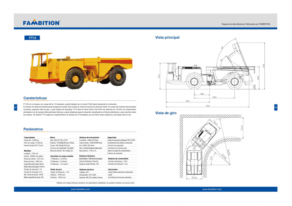 FT12 aplica una transmisión lateral para maximizar la buena capacidad de visión en túneles. Tiene dimensiones compactas y radio de giro, gran ángulo de descarga. Equipado con el motor DEUTZ F8L413FW de 136 kW de potencia nominal, elige la marca internacional para todos los componentes clave para enfrentar diversos desafíos en la minería subterránea. De hecho, la carga útil FT12 es de 15 toneladas, lo que significa una mayor capacidad de duración y vida útil.