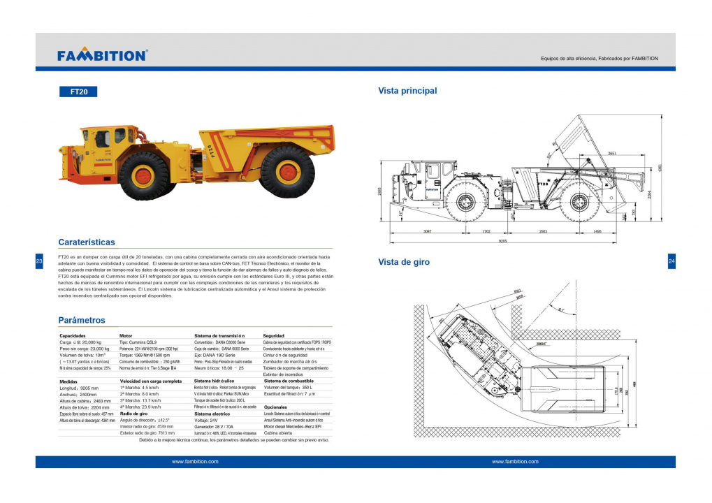 FT20 tiene una carga útil nominal de 20 toneladas, estándar con cabina orientada hacia adelante completamente cerrada con aire acondicionado, que tiene un amplio campo visual y comodidad para el conductor. El sistema de control del vehículo adopta la tecnología de comunicación CAN-bus, Fambition Electronic Técnico, control piloto proporcional electrohidráulico y sistema hidráulico variable. El sistema de control está diseñado sobre la base del bus CAN. La pantalla de visualización integrada puede mostrar los parámetros de funcionamiento del raspador en tiempo real y tiene las funciones de advertencia de falla y autodiagnóstico. El camión adopta el motor EFI refrigerado por agua Cummins para cumplir con los estándares de emisiones Euro IIIB, y otras partes adoptan marcas internacionalmente conocidas para cumplir con las condiciones difíciles y los requisitos de escalada subterránea. El sistema de lubricación automática de Lincoln y el sistema de extinción automática de incendios Ansul son opcionales.