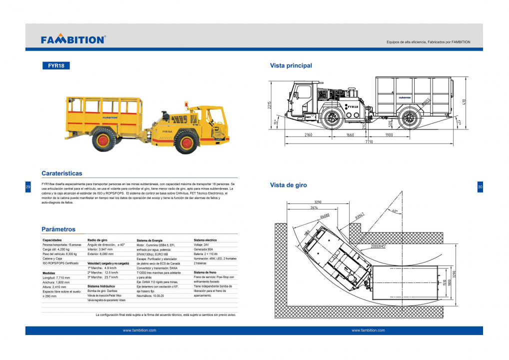 FYR18 es un portador de hombre especialmente diseñado para minería subterránea, máx. Capacidad 18 personas. Aplica diseño articulado central con asistencia de un dispositivo de dirección para radio de giro pequeño y recorrido de túnel. La cabina y el carro tienen certificación ISO y FOPS / ROPS para garantizar la seguridad. todo el sistema de control del vehículo adopta tecnología de comunicación CAN-bus, Fambition Electronic Technician, control piloto proporcional electrohidráulico y sistema hidráulico variable. El sistema de control está diseñado sobre la base del bus CAN. La pantalla de visualización integrada puede mostrar los parámetros de funcionamiento del raspador en tiempo real y tiene las funciones de advertencia de falla y autodiagnóstico.