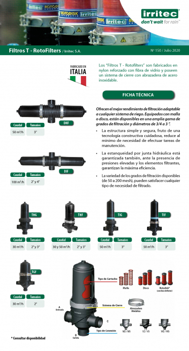 La amplia gama de Filtros “Y”, “T” y “Rotofiltros T” de Irritec® ofrecen el mejor rendimiento de filtración y son adaptables a cualquier sistema de riego.