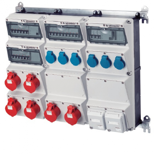 • Equipado con: bases CEE de 16 A, 3 polos hasta 63 A, 5 polos, bases con toma de tierra según diferentes estándares nacionales bases DUO con interruptor y enclavamiento de 16 A, 3 polos hasta 63 A, 5 polos, además de elementos fusibles.