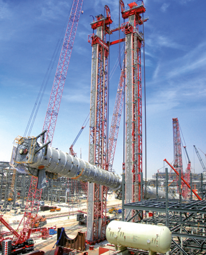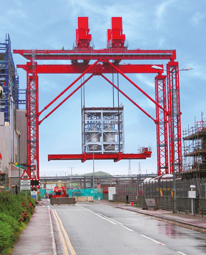 Un pórtico es una combinación de dos o más patas (torres) y una viga aérea o construcción de vigas. A la viga superior se conecta un dispositivo de elevación (ya sea un cabrestante o un gato de cable). Se pueden construir pórticos para cumplir con los requisitos específicos de la ubicación. Como solo pueden levantarse verticalmente, la versatilidad es limitada y deben construirse sobre los cimientos. Si se requiere movimiento de la carga, el sistema de pórtico completo y la carga se pueden deslizar sobre rieles de una posición a otra. El pórtico de la torre se puede configurar para levantar cargas de 500 a 4.000 toneladas.