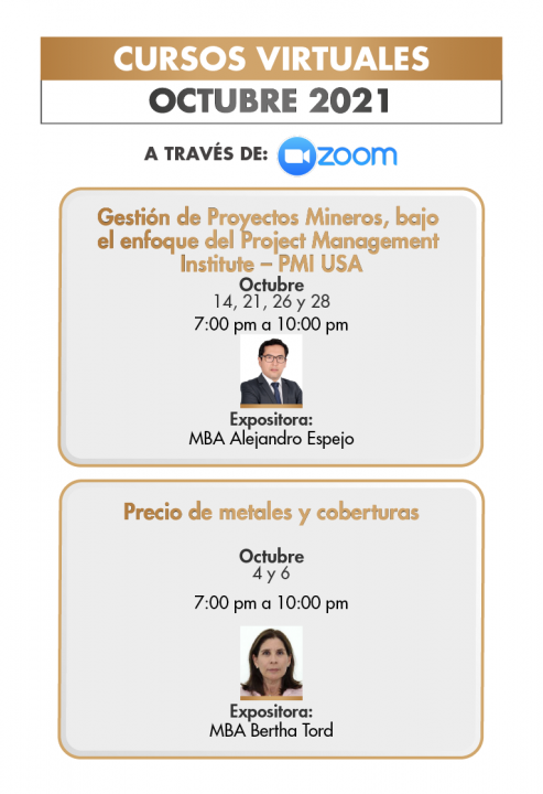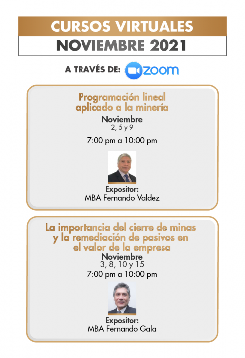 Los cursos especializados son ofrecidos por destacados profesionales en las aulas del IIMP o en modalidad virtual, ya sea para el público en general o para el personal de su empresa (Cursos In House). Reforzando y actualizando los conocimientos adquiridos por los participantes durante su estancia universitaria y profesional. La finalidad es contribuir al desarrollo y mejora continua de las capacidades del capital humano para el mejor desempeño personal y logro de mayor productividad empresarial. La currícula aplicada cubre las distintas áreas de acción de una empresa principalmente minera.