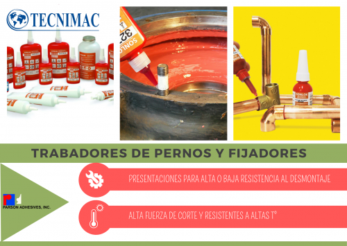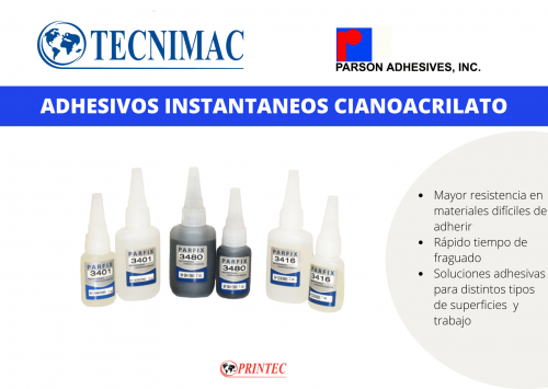PRINTEC S.A a través de su filial TECNIMAC, dentro de sus líneas de productos y servicios cuenta con Adhesivos Anaeróbicos, Epóxicos e Instantáneos de la reconocida marca americana PARSON, creados con ingeniería de alto rendimiento, otorgándole resistencia y durabilidad. Nuestros productos son utilizados en procesos de manufacturación industrial, departamentos de mantención de distintos mercados como minería, metalmecánica, pesquero, celulosa, transporte automotriz y aéreo; e industria en general.