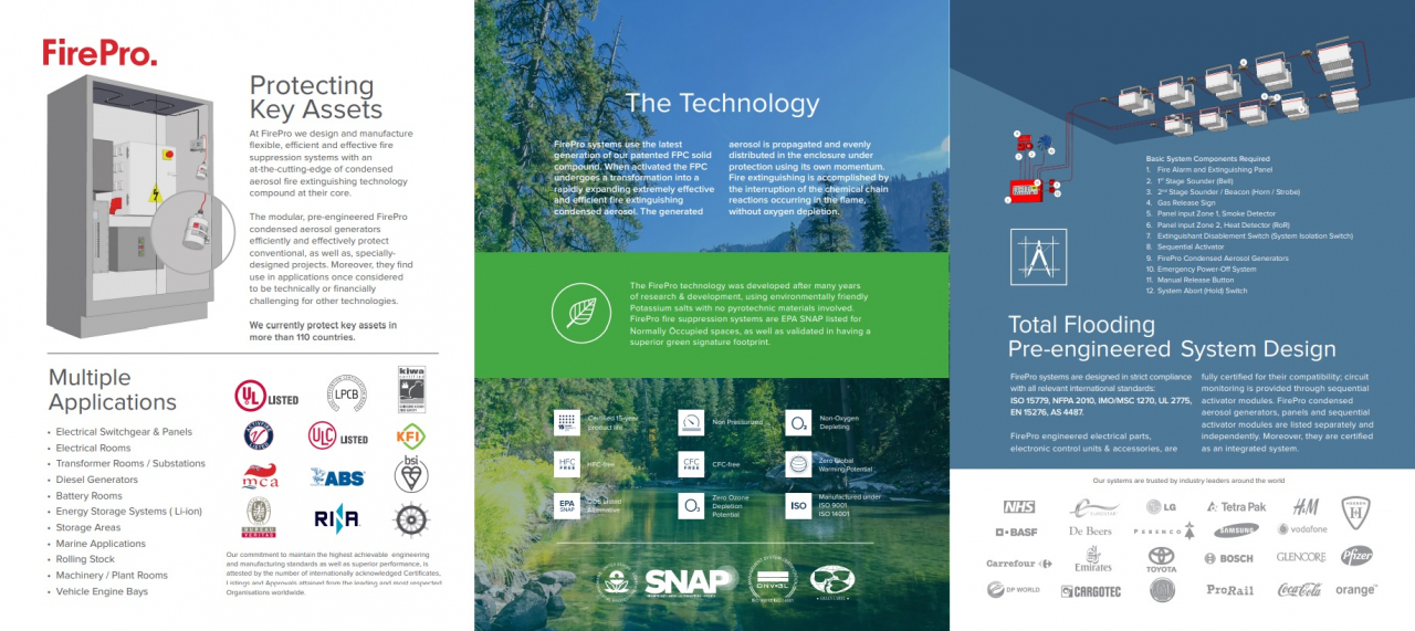 Firepro es líder mundial en la fabricación de la tecnología de extinción de incendios en base de aerosol condensado. La empresa se dedica a la investigación, fabricación, diseño y distribución de sistemas de supresión de incendios, y tiene un especial enfoque en cuanto a privilegiar la salud y seguridad de las personas y el medio ambiente.