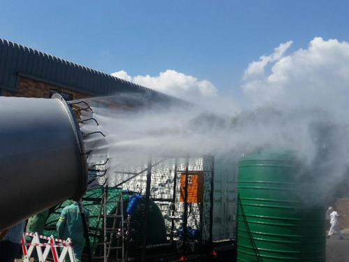 El agua pasa a través de las boquillas a alta presión, distribuyéndose en grandes áreas por un ventilador de tamaño industrial y se adhiere a las partículas de polvo evitando que floten en las corrientes de aire. El sistema vienen en unidades móviles que se pueden mover a diferentes áreas de las plantas, pilas de almacenamiento, botaderos o áreas de voladura, pueden interconectarse y activarse directamente por la sala de control, por sensores o mediante activación remota.