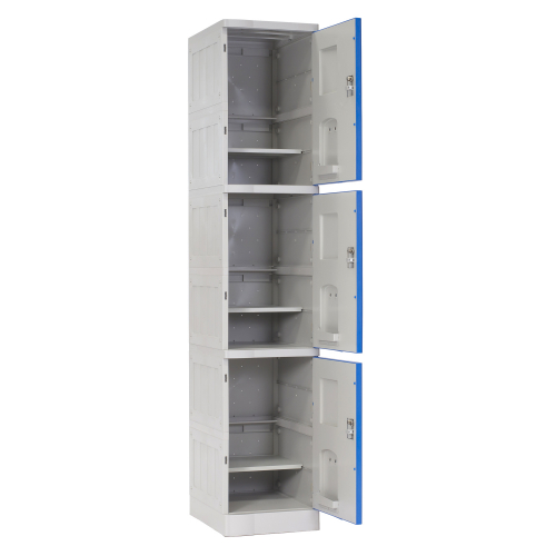 Locker Plástico ABS de 1 cuerpo/3 puertas. Muebles modulares que proveen máxima seguridad, ofrecen alto rendimiento en áreas de calor y humedad. Fáciles de limpiar y mantener, eficientes y seguros, ideales para aplicaciones en diversos espacios e industrias. Construídos con material plástico ABS reciclable. Escoja sus modelos y colores favoritos para diseñar modulaciones.