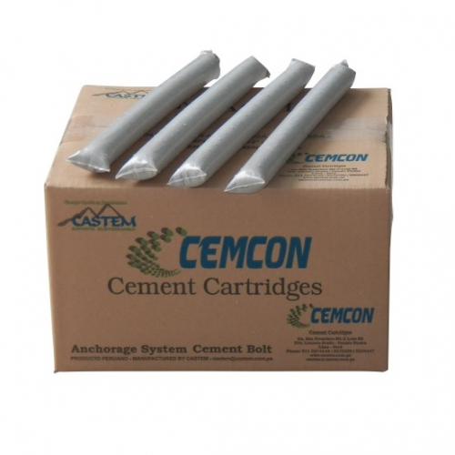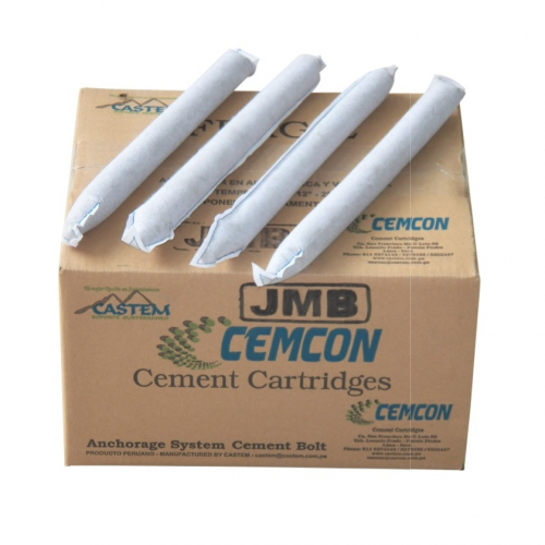 Los cartuchos de cemento CEMCON han sido desarrollados con el fin de ser utilizados para el anclaje de pernos como parte de los sistemas de sostenimiento en minería u obras civiles y están especialmente diseñados para su óptimo desempeño tanto en procedimientos de instalación manual como automatizada. Este producto consiste en una mezcla cementicia contenida en un cartucho de plástico perforado (CEMCON) y pellon (CEM CON JMB), que al ser sumergido en agua permite su humectación controlada para ser utilizado como parte de sistemas de sostenimiento. Diámetros disponibles: 28, 29 y 30 mm. Longitudes disponiles: de 300 a 610 mm.