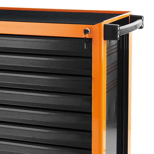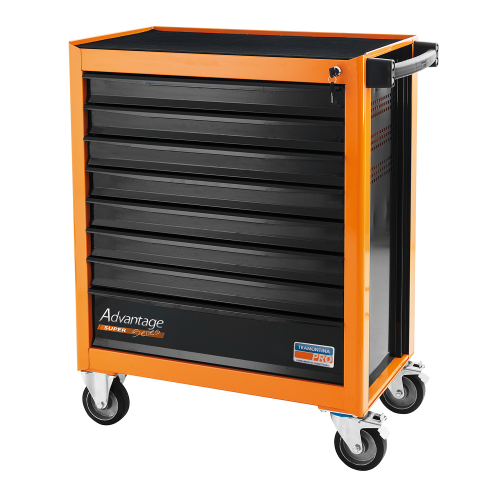 Estructura con paredes reforzadas. 8 compartimentos con rieles telescópicos (7 bandejas de 75 mm de altura, 1 cajón de 155 mm + una puerta). Las correderas telescópicas garantizan un deslizamiento suave y mayor apertura de los cajones, en comparación a las correderas tradicionales. Trabas para los cajones y puerta. Ruedas delanteras fijas y traseras giratorias, de goma de 125 mm de diámetro. Ruedas traseras con freno individual. La pintura electrostática forma una capa protectora que garantiza un excelente acabado y resistencia a la corrosión. Tirador ergonómico y cubierta de goma.