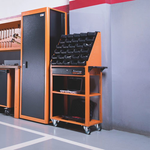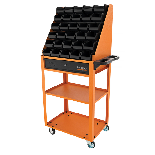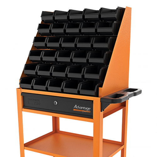 El Carro Cubetas se utiliza para el almacenamiento de piezas pequeñas, tales como tornillos, tuercas y arandelas. Posee 30 cubetas BIN número 3, 2 bandejas y un cajón con rieles telescópicos.