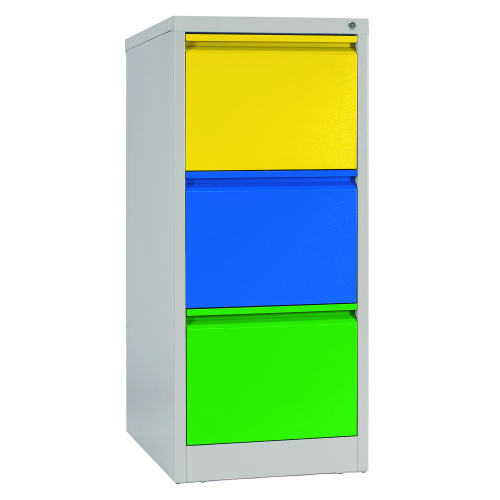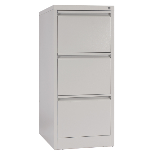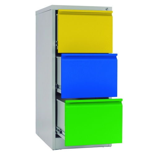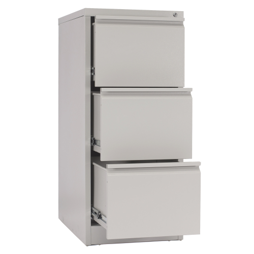 Mueble de 3 cajones, cada uno cuenta con manilla de apertura y rieles laterales deslizantes, apertura de cajones 100% y capacidad de carga por cajón 45 kgs. Material acero laminado SAE 2020. Cerradura con llave tipo escritorio que traba todas las puertas. Ideal para guardado de archivos, documentos y diversos elementos de oficina.