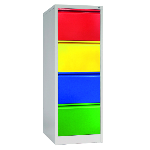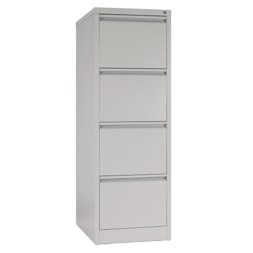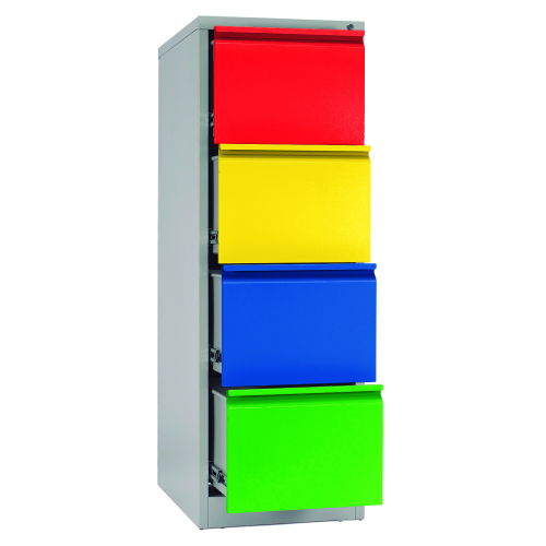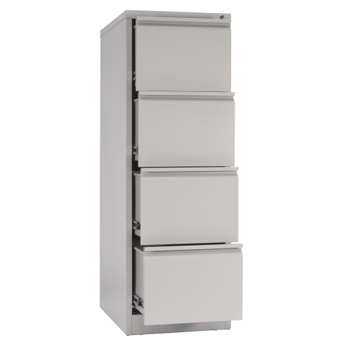 Mueble de 4 cajones, cada uno cuenta con manilla de apertura y rieles laterales deslizantes, apertura de cajones 100% y capacidad de carga por cajón 45 kgs. Material acero laminado SAE 2020. Cerradura con llave tipo escritorio que traba todas las puertas. Ideal para guardado de archivos, documentos y diversos elementos de oficina.