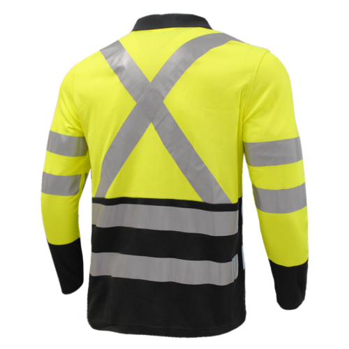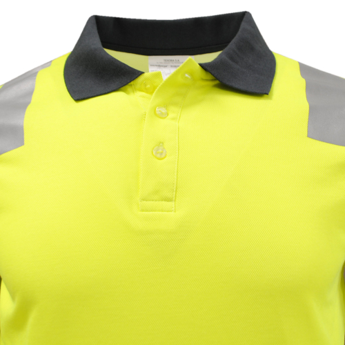 Polera polo alta visibilidad bicolor manga larga diseñada con tecnología "dual protection" nos entrega una fusión perfecta para el cuidado de tu piel, permitiendo a tu cuerpo liberar la transpiración sin sentir la sensación de humedad, combinando elementos de alta visibilidad es la prenda perfecta para desarrollar trabajos en entornos viales, gracias a que posee cintas reflectivas termoselladas de 5 cm de ancho y cinta en forma de X en la espalda para cumplir con la norma Chilena de seguridad. Posee cuello polo en tela rib y solapa frontal de tres botones, esta prenda cuenta con filtro UPF entregando mayor protección contra los rayos ultravioleta.
